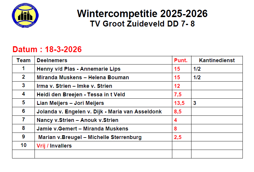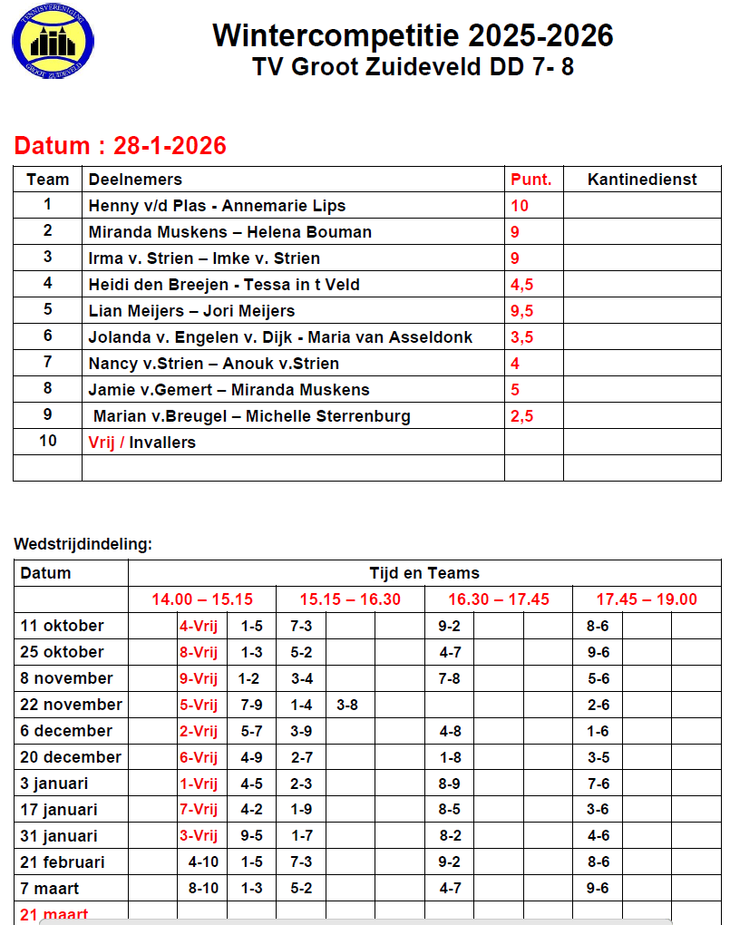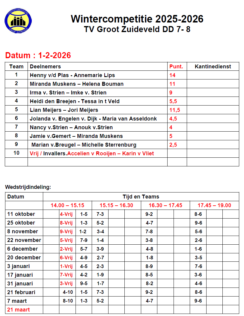 Kantinedienst Wintercompetitie 2025-2026